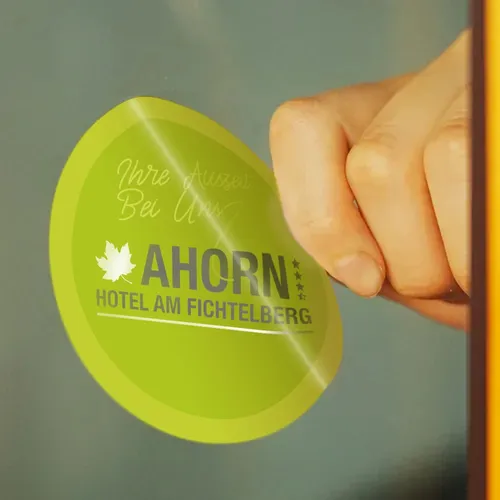 Aufkleber für die Vorderseite sind auf durchsichtigem Material gedruckt und haben einen Kleber auf der bedruckten Vorderseite des Aufklebers. Diese Aufkleber sind besonders hilfreich für bestimmte Anwendungen, wie z. B. für Geschäfte, die ihren Kunden relevante Informationen anzeigen möchten, wie z. B. die Verkaufssaison, die von ihnen unterstützten Projekte und vieles mehr.