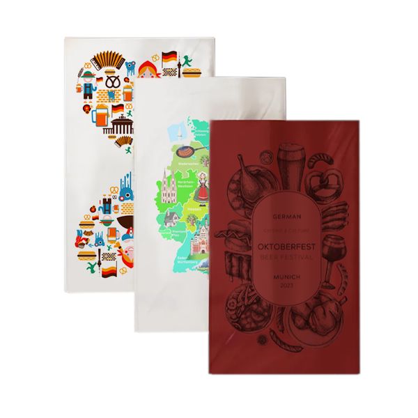SPEZIFIKATIONEN Material: Stoff (Leinen) Druckoption: Kann in Vollfarbe oder einfarbig bedruckt werden. Größe 20,5 cm x 10 cm Serviettenfarben: • Weiß • Rosa • Seeblau • Grau • Marineblau • Schwarz • Königsblau • Violett • Grün • Burgunderrot • Schwarzgrün • Champagner • Gelb • Bordeauxrot • Rot • Orange • Rosarot • Cremefarben
