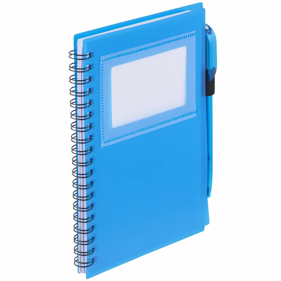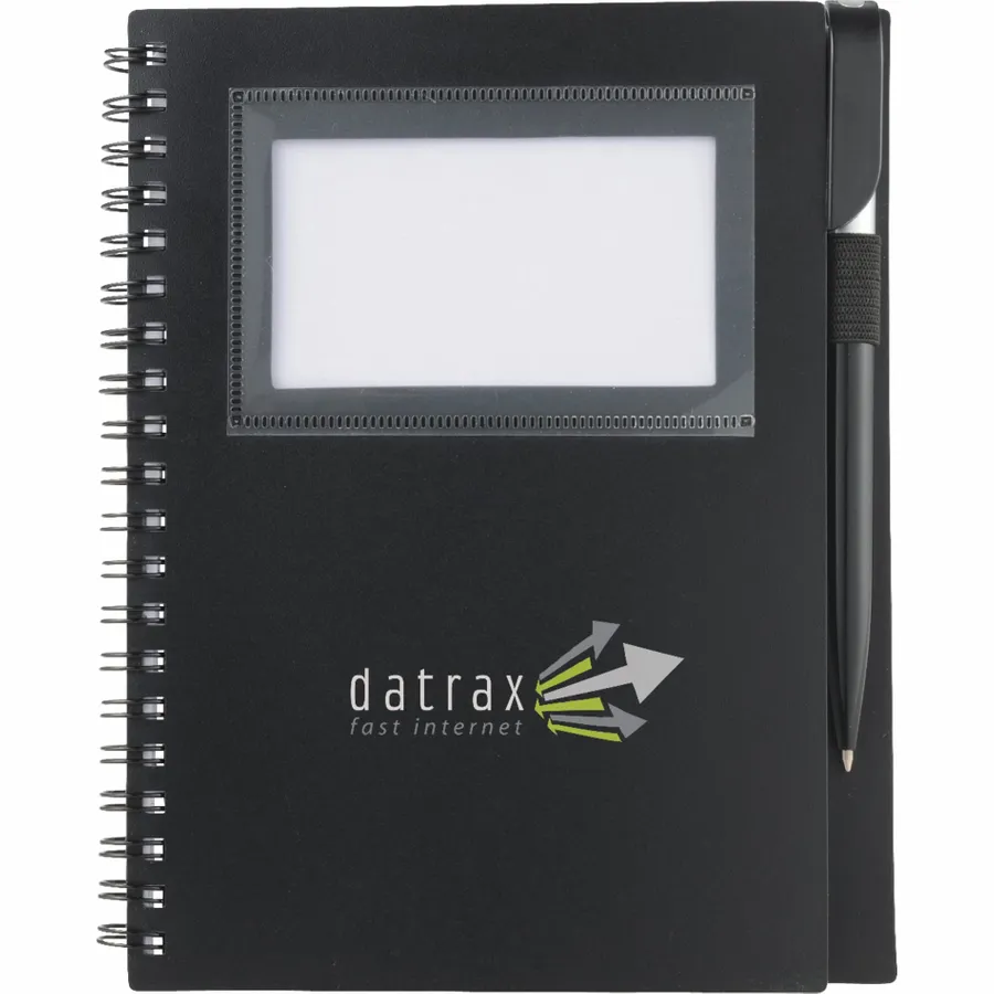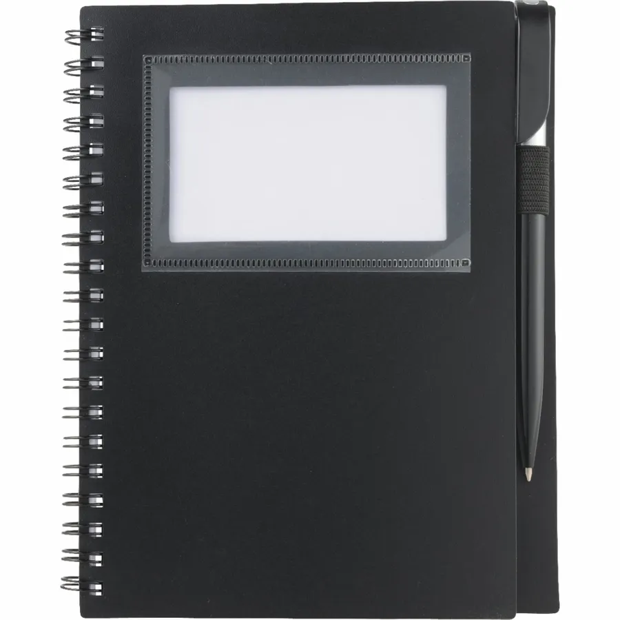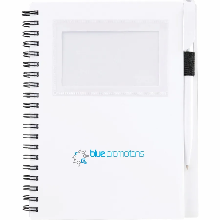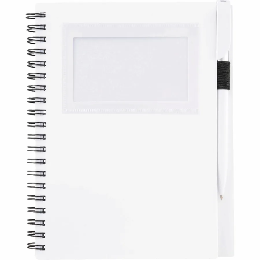 Das Bullet 5,5 x 7 FSC Mix Star Spiral-Notizbuch mit Stift hat ein durchsichtiges Fenster auf der stabilen Polypropylen-Vorderseite, in dem Sie Ihren Fotoausweis oder Ihre Visitenkarten aufbewahren können. Zum Lieferumfang gehört ein passender Drehkugelschreiber, der sich in der integrierten Stiftschlaufe des Notizbuchs verstauen lässt. Das Star Spiral Notebook enthält 70 linierte Blätter aus FSC-Mix-Papier und wird getrennt vom mitgelieferten Stift verpackt.